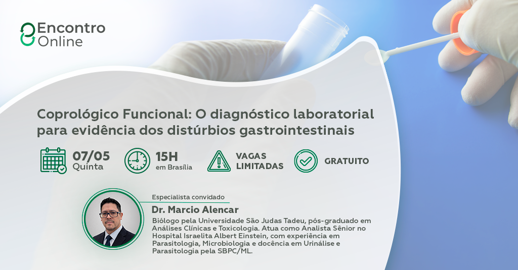 O encontro será realizado no dia 07/05 (quinta-feira), às 15h, com o tema “Coprológico Funcional: O diagnóstico laboratorial para evidência dos distúrbios gastrointestinais”.
