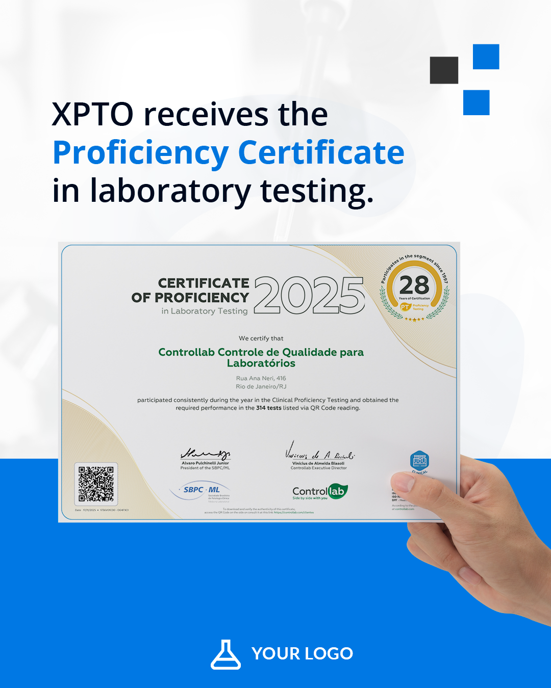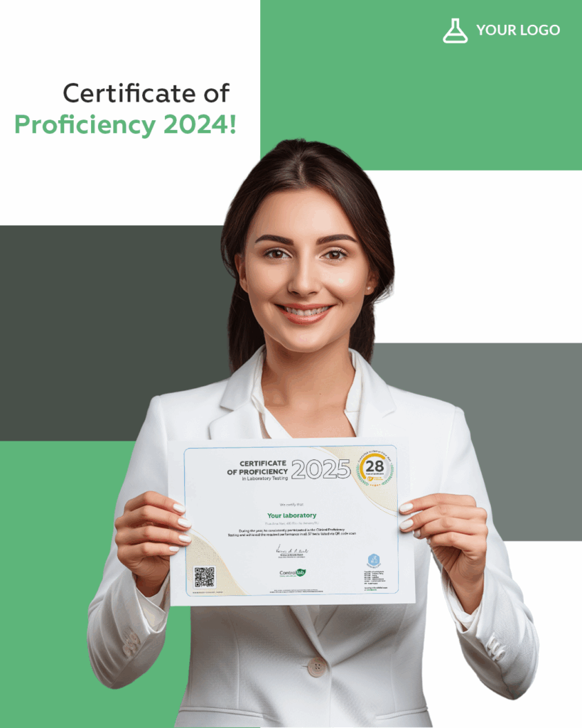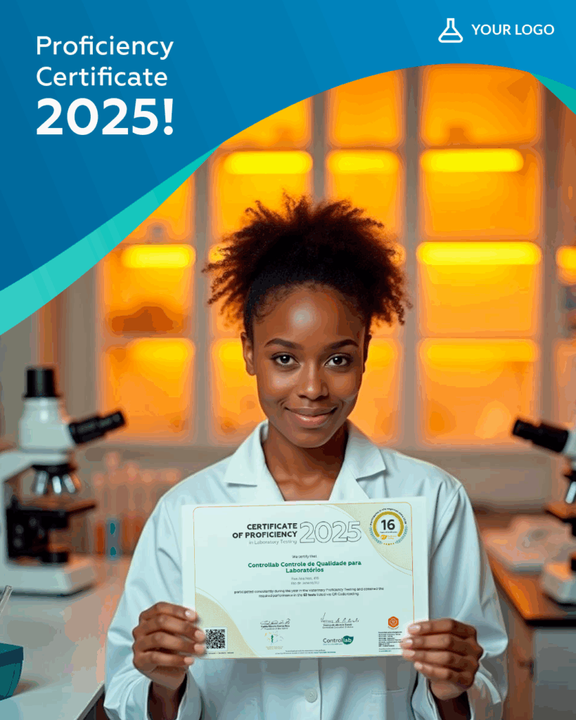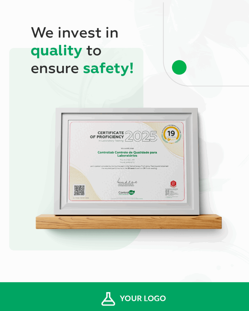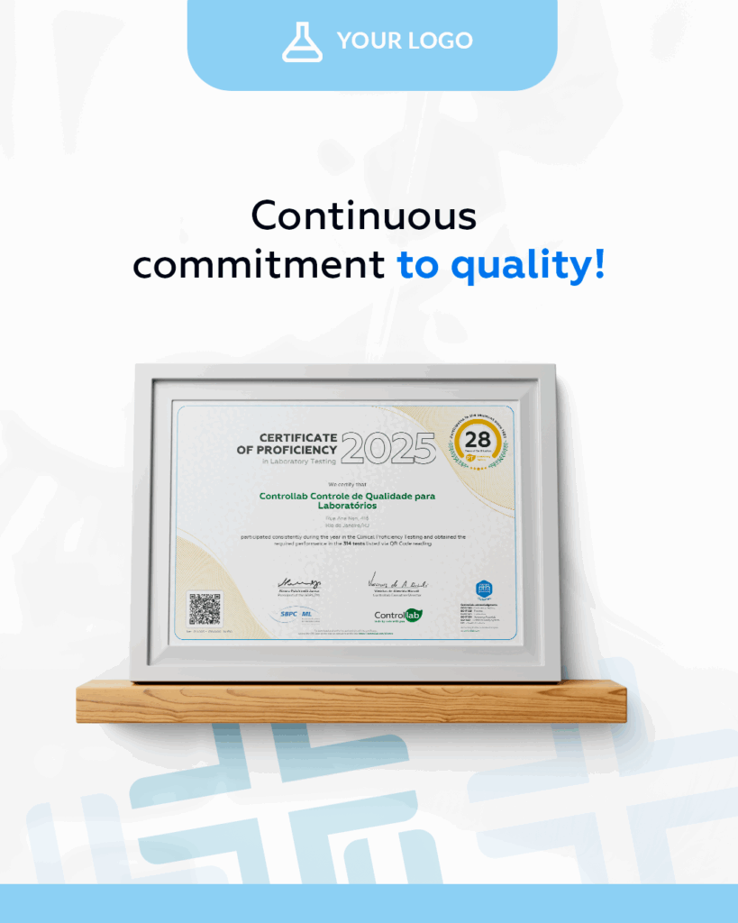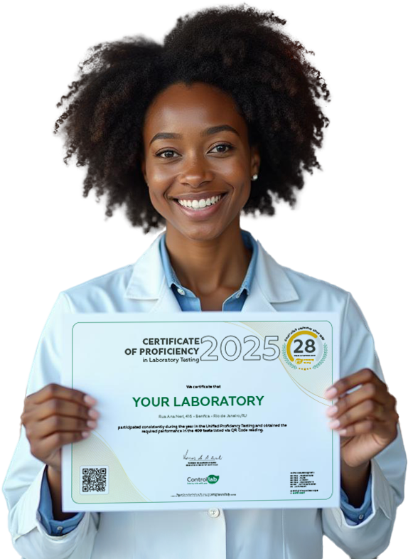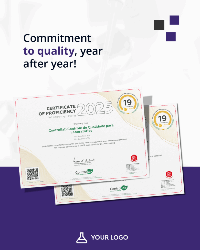 In addition to the certificate, we offer the QC Seal (Quality Control), personalized for your laboratory. It features the Controllab logo and a QR code that proves your participation in the service.